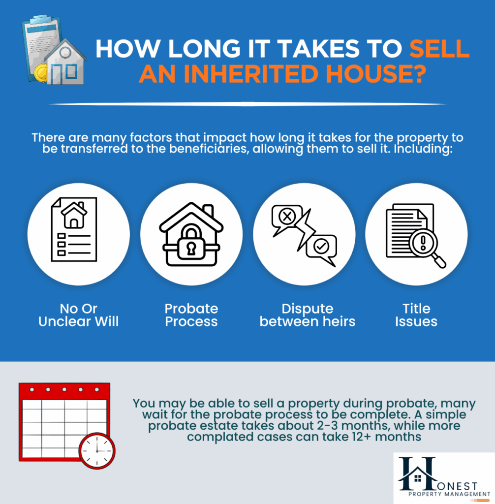 If probate is not required, you can typically sell the inherited house as soon as ownership records are updated and the title is confirmed free of liens.
